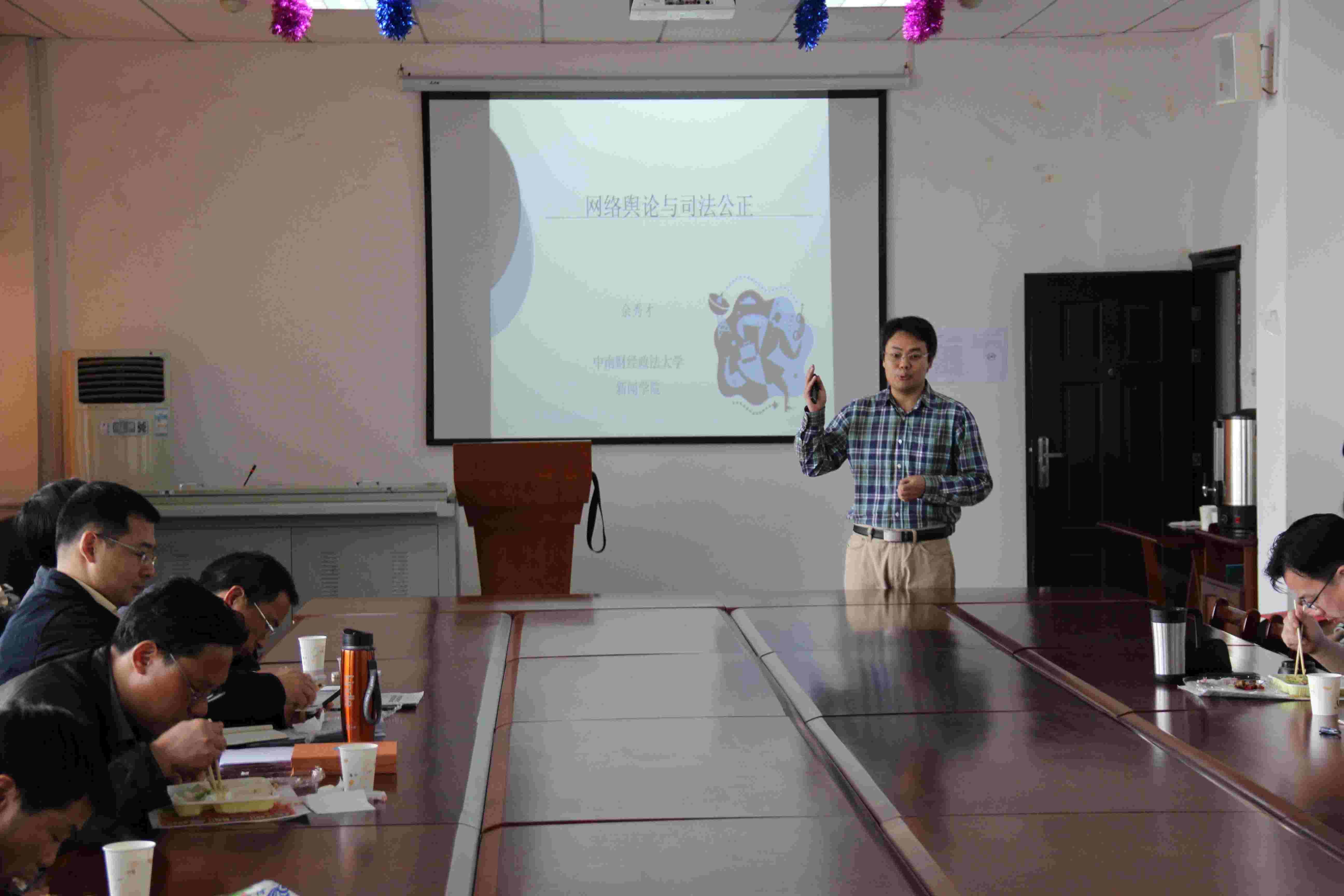 4月23日中午,91大神 第十二期学术午餐会在文治楼二楼会议室举办。本次学术午餐会以“网络舆论与司法公正”为主题,由新闻与文化传播学院余秀才副教授主讲,杨柳老师主持。91大神 院长夏勇教授、副院长童德华教授、郭泽强副教授、周凌副教授等刑法与公安学科老师及部分博士生、研究生、本科生参加了此次活动。