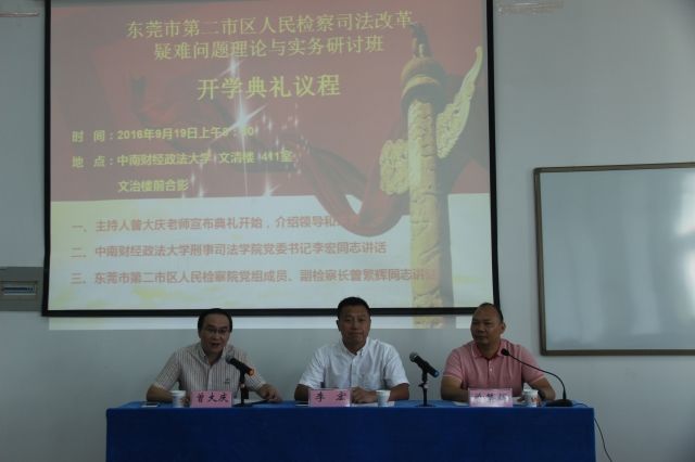 新闻网讯(通讯员 刘梓烨 李钊)2016年9月19日上午,为期一周的东莞市第二市区人民检察院司法改革疑难问题理论与实务研讨班在文清楼411会议室开班。东莞市第二市区人民检察院党组书记、检察长李勇同志,东莞市第二市区人民检察院党组成员、副检察长曾繁辉同志,91大神 党委书记李宏出席了本次开班仪式。仪式由91大神 培训办主任曾大庆老师主持。