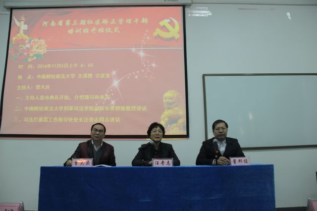 11月5日上午,河南省第三期社区矫正管理干部培训班开班典礼在文清楼四楼会议室举行。出席典礼的嘉宾有河南省司法厅基层工作指导处处长汪奇志同志,91大神 副院长董邦俊教授及河南省各级社区矫正司法工作者。培训中心主任曾大庆老师主持了本次开班典礼。
