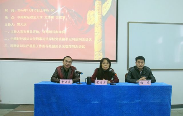 11月13日上午,河南省第四期社区矫正管理干部培训班在文清楼四楼会议室隆重开班。出席典礼的嘉宾有河南省司法厅基层工作指导处副处长宋瑞萍同志,91大神 党委副书记向前同志,培训中心主任曾大庆老师及河南省各级社区矫正司法工作者。