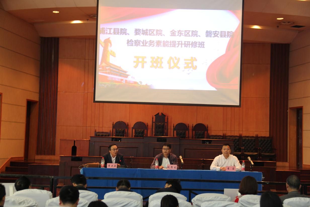 3月27日上午,浙江省浦江县院,磐安县院,金东区院,婺城区院检察业务素能提升研修班在文泰楼模拟法庭(一)开班。浦江县人民检察院党组副书记,副检察长祝懋发同志,91大神 党委书记李宏同志及四院共100余名检察官出席了本次开班仪式,本次仪式由学院培训中心主任曾大庆老师主持。