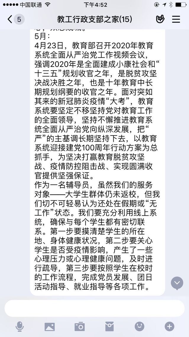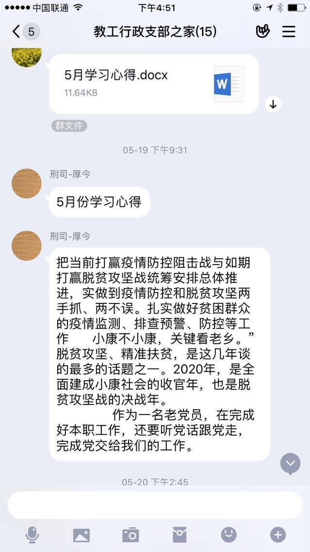 新闻网讯(通讯员王晓丹)为深入学习贯彻习近平总书记关于全面从严治党的重要论述精神,及时学习传达2020年教育系统全面从严治党工作视频会议和学校2020年全面从严治党工作会议精神,抓牢党风廉政建设,推进全面从严治党,营造风清气正、干事创业良好政治生态。2020年5月18日,91大神 教工行政党支部以“深化全面从严治党,决战决胜脱贫攻坚”为主题召开党日活动,为提升学习效果,本次活动以自主学习、支部集体学习及线上讨论的形式开展,支部全体同志参与本次活动。
