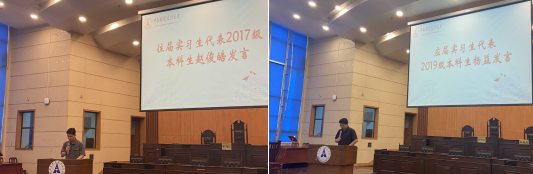 大会伊始,来自2017级的赵俊皓同学作为往届生代表,首先给师弟师妹们传授了宝贵经验。他强调要理论联系实践、个人同频国家,他从“发展”角度谈了实习之于个人的意义。他还详细阐述了实习过程中用语、作息、态度这“三难”和信念、良师、挚友这“三得”。