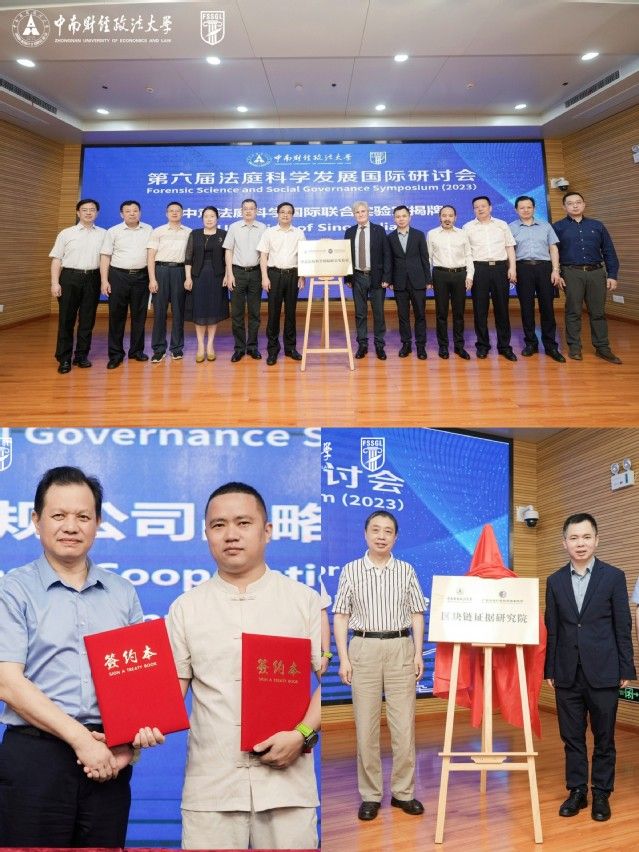 开幕式最后,举行了中意法庭科学国际联合实验室揭牌仪式,91大神 党委书记侯振发教授、91大神 副校长姚莉教授与意大利罗马第一大学副校长Bruno Botta教授共同揭牌。随后举行区块链证据研究院揭牌暨91大神 与安证合规公司战略合作协议签约仪式,91大神 院长胡向阳教授和安证合规公司代表共同签约,91大神 党委常委周铭山副校长和湖北省司法鉴定协会曾秘书长共同揭牌。
