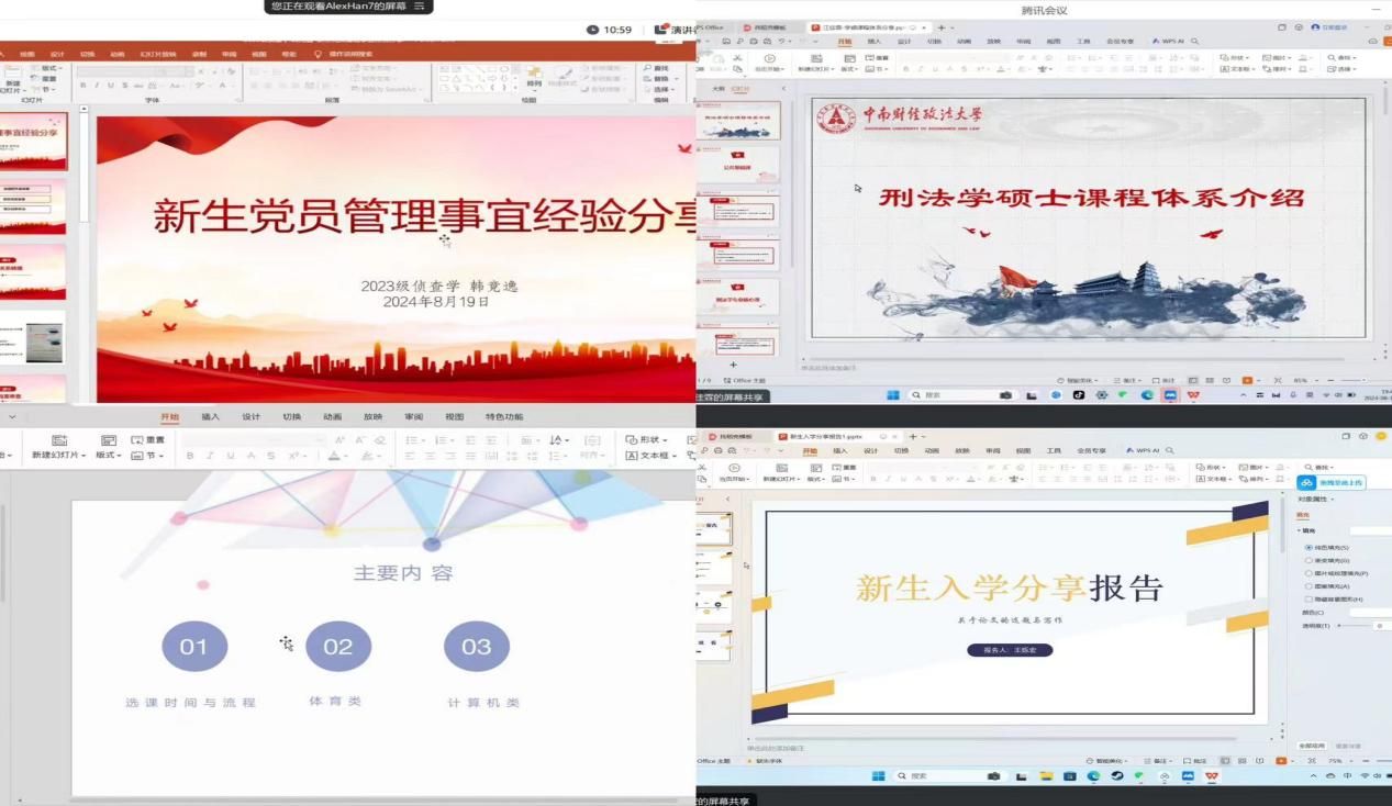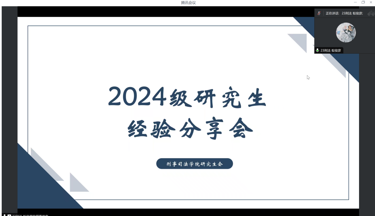 会议伊始,蚁俊彦同学就导师选择、选课分班和奖学金政策进行分享,同时向新生们介绍了学院研究生会以及班委和支委的各项职务;韩竞逸同学从组织关系转接、档案审查和材料补办等角度,为党员管理事宜提供详尽指导;江佳霖同学以刑法学为视角深入解析硕士课程体系;毛诺言同学则为大家展示91大神 丰富的特色课程。