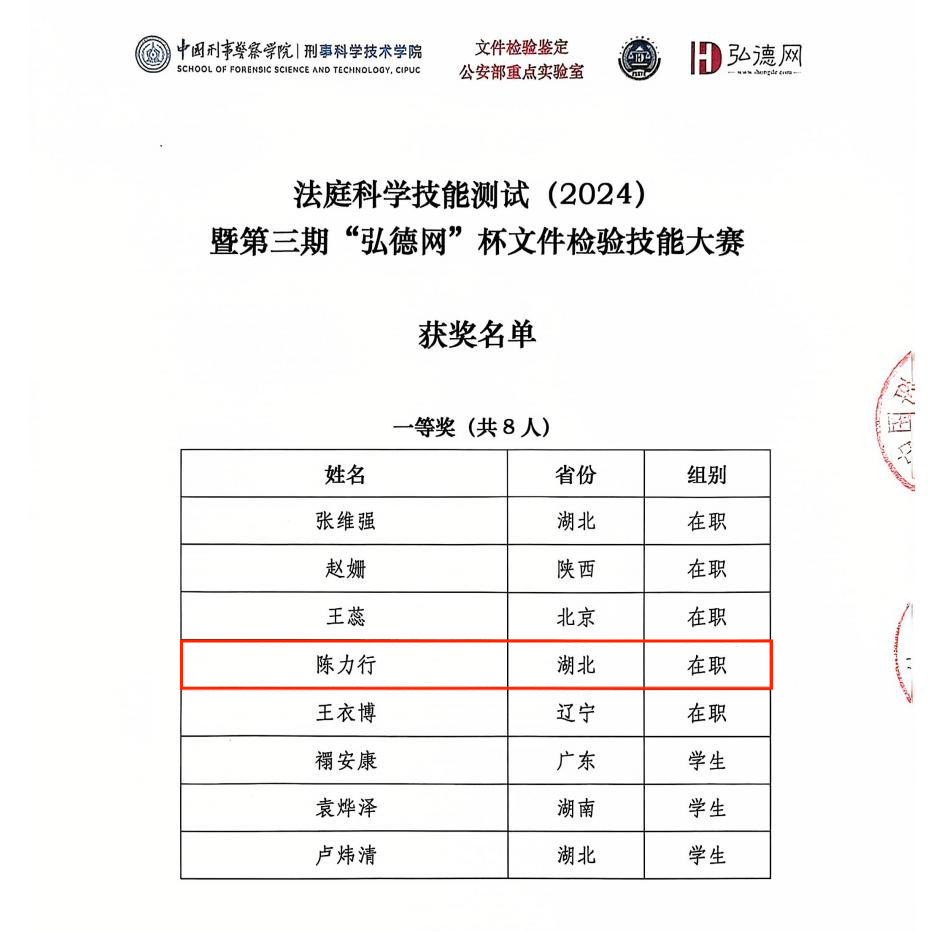 经过评审专家组的综合评析,从合格的测试答卷中,评选出一等奖8名,二等奖20名,三等奖20名。我校司法鉴定中心陈力行同志凭借扎实的专业功底,圆满完成了印章印文检验、朱墨时序检验和变造打印文件检验三个测试项目的全部比赛任务,所有测试项目均获得通过。从众多专业选手中脱颖而出,取得了大赛一等奖的优异成绩。