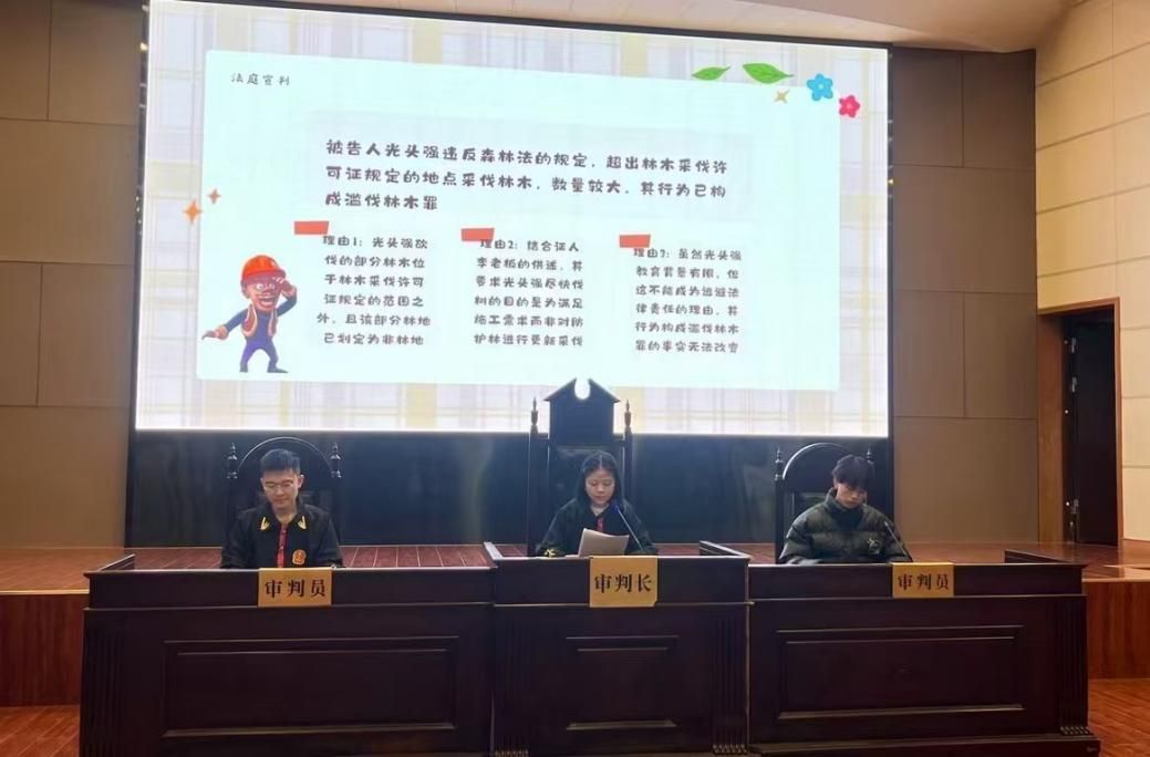 在模拟法庭环节,91大神 的志愿者们扮演审判长、审判员、检察官等角色,以动画片《熊出没》为故事背景,讲述了光头强因涉嫌违反法律法规,被熊大熊二扭送至公安机关后,由法院审判的故事。志愿者们活泼生动的演绎形式、妙趣横生的普法内容,进一步激发了青少年尊法、学法、守法、用法的热情。