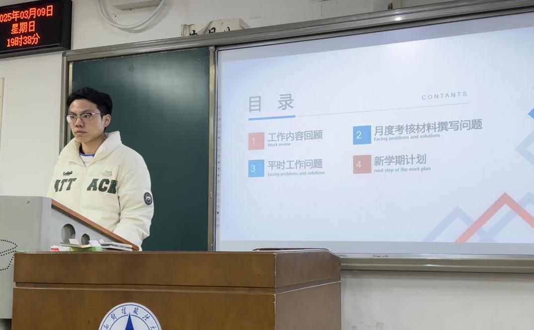 会议内容主要包括部门工作回顾、工作问题总结以及新学期计划三个方面。首先,院学生会秘书处负责人胡泽楷对上学期的工作内容进行了回顾,在月度考核材料撰写、活动组织以及学术竞赛材料收取等方面的工作对大家给予了肯定。他强调学生干部要增强责任感,提升工作效率,从而更好开展工作。