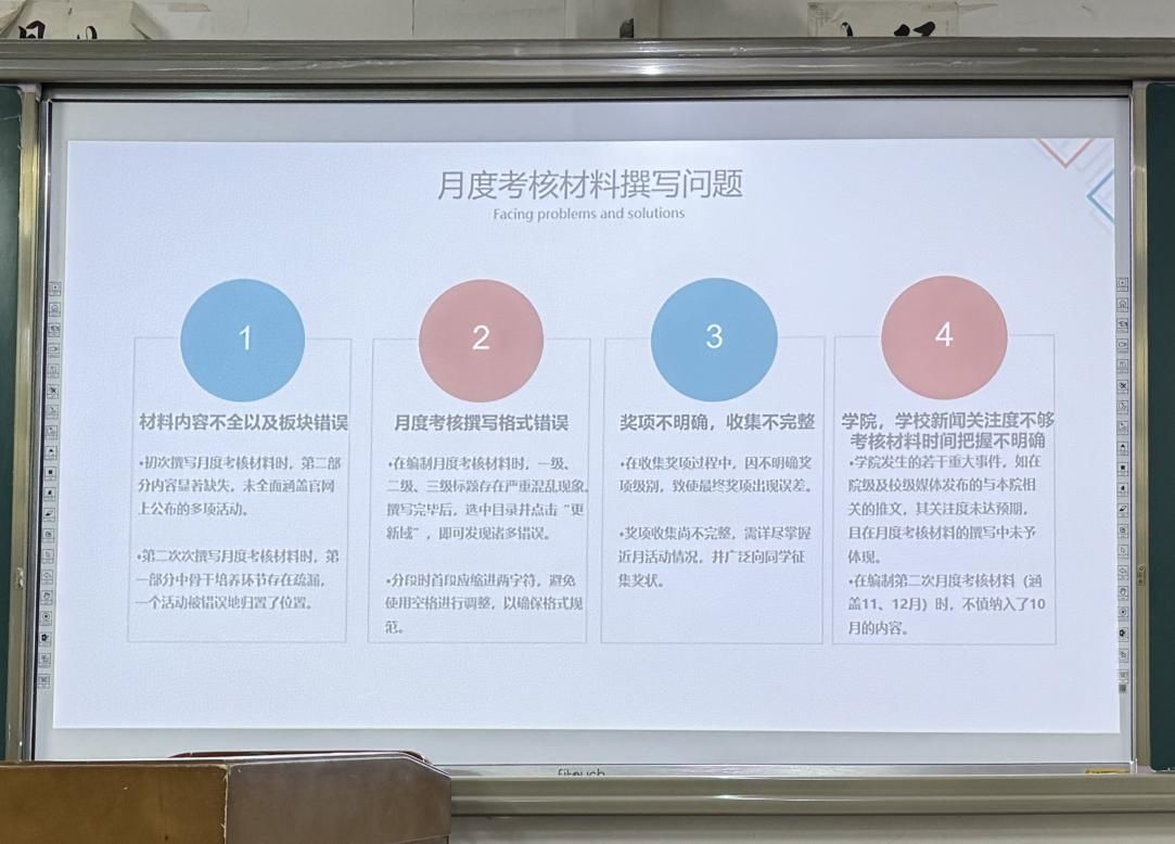 会议第二项,院学生会主席团成员黄希哲对月度考核工作开展情况进行了总结,并指出了工作中出现的问题,对下来的工作提出了更高的要求。她强调在撰写月度考核材料时,要重视材料细节,明确注意事项,规范书写格式。同时她希望大家不断进步、积极交流,力求在未来的实践中取得更加优异的成绩。