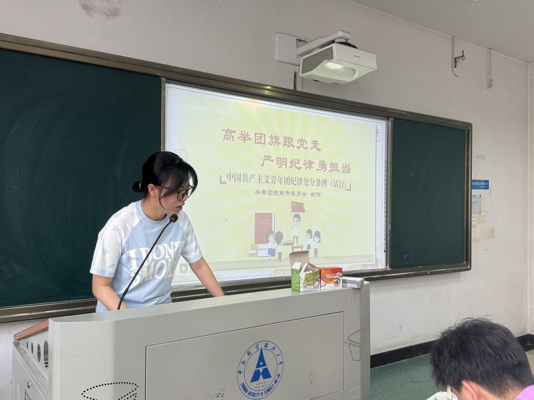 活动伊始,团支书蒋承洋强调了《条例》学习的重要意义。她指出,新时代的共青团员肩负着民族复兴的历史使命,应将纪律要求转化为内在行动。学习团纪处分条例能帮助团员明辨是非界限,规范日常言行,为同学们成长为合格的社会主义建设者和接班人奠定基础。