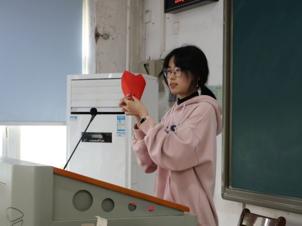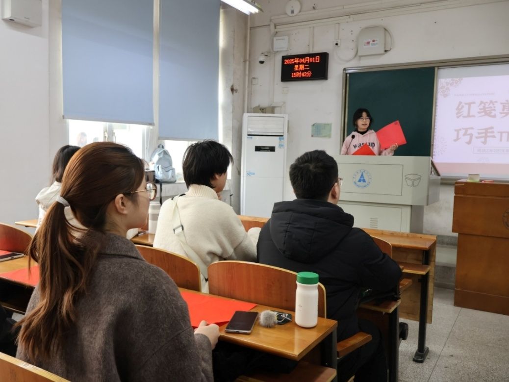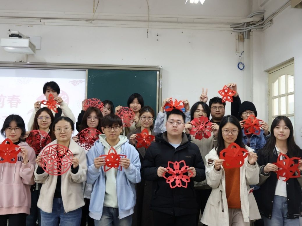 随后,同学们将理论与实践相结合,把火红的纸折成对称形状,用铅笔勾勒出花鸟鱼虫,红纸翻飞如蝶,剪刀游走似笔。“咔嚓咔嚓”声此起彼伏,笨拙的线条逐渐灵动,一个个精巧的剪纸作品完成了。空气中氤氲着纸香,同学们触摸的不仅是非遗技艺的温度,更是中华美学的灵魂,传统和现代在这一刻完美交融。