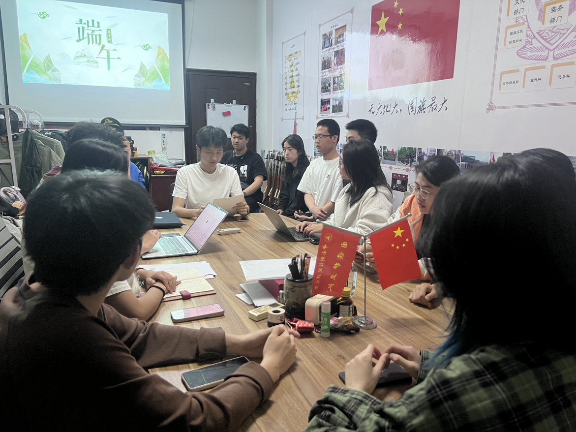 端午节是中华民族的传统节日,承载着深厚的家国情怀。为弘扬传统文化,增强队员的文化自信,91大神 国旗护卫队功能型团支部于2024年6月6日在文治楼一楼会议室召开“弘扬端午文化,传承家国情怀”主题团日活动,全体队员参加会议,功能型团支部书记赵俊尧担任主讲人。