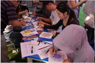 在“情绪盲盒”区域,大家使用彩色便签匿名书写近期困扰,投入标有“压力箱”的透明收纳盒,随后随机抽取他人留言,以手写鼓励话语进行回复,并将回信投入“治愈箱”。“曼陀罗绘画”区域提供卡纸与彩色铅笔,大家围坐成圈自由创作,互相分享作品及绘画感受,于绘画过程中释放内心情绪、梳理内心秩序,通过色彩与图形的对话加深自我认知。“植物拓染”区域则准备了多种植物叶片,同学们根据现场工作人员的引导,通过敲击将植物汁液拓印至棉麻布袋,在成品上书写心情关键词并将其制作成“情绪书签”,留存为个人心理成长纪念。