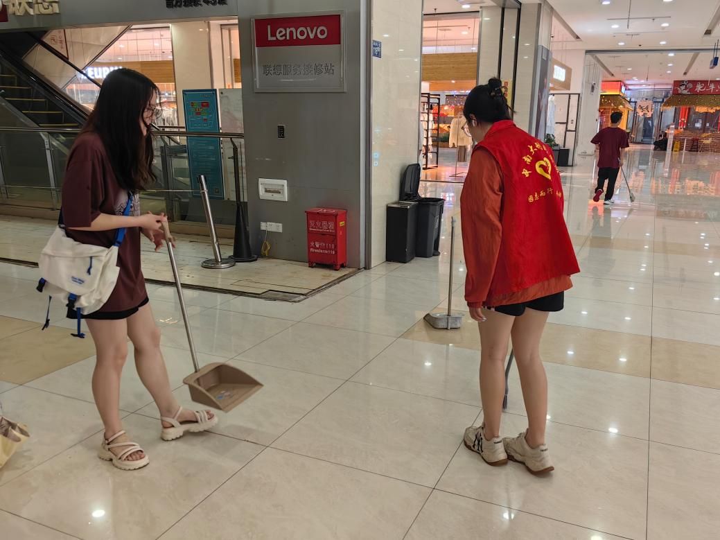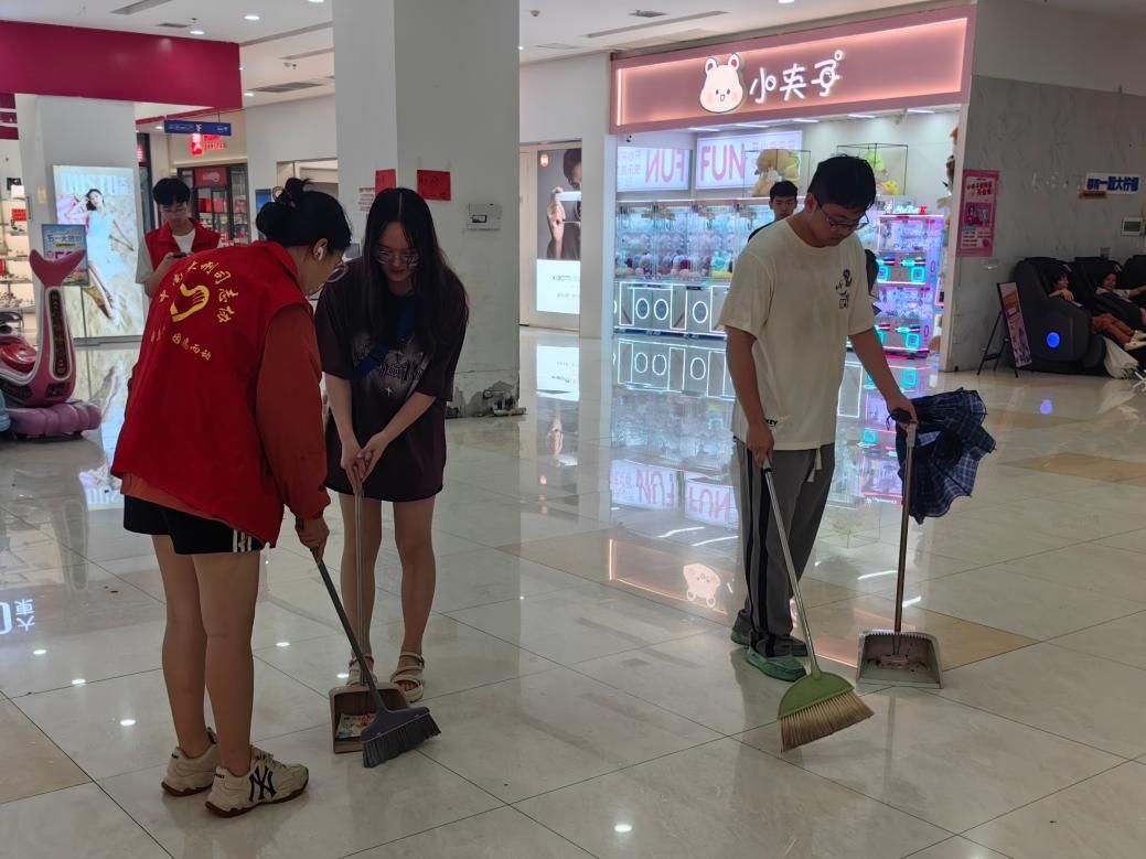 活动伊始,所有同学在文治楼前集合,分配清洁工具并合影留念。尽管暴雨倾盆,但同学们还是准时抵达了政苑小区。他们手持扫帚、垃圾袋等清洁工具,以高昂的热情投入到卫生清洁行动中。同学们相互配合,认真细致,在社区与商场的各个角落对地面、墙角等区域进行了清扫整理。经过几个小时的努力,周边环境焕然一新,看到自己的劳动成果,大家的脸上都露出了欣慰的笑容。