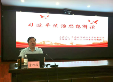 在授课中,董邦俊教授深刻阐述了习近平法治思想的形成、意义及其核心内涵和科学方法,突出强调坚持党对全面依法治国的领导,筑牢监狱工作政治根基。董邦俊教授首先强调,党的领导是推进全面依法治国的根本保证,也是监狱工作的“魂”。他结合湖北省监狱系统开展习近平法治思想现场教学的实践,指出监狱作为国家刑罚执行机关,必须以高度的政治自觉压实执法责任,确保执法权力始终在法治轨道上运行。