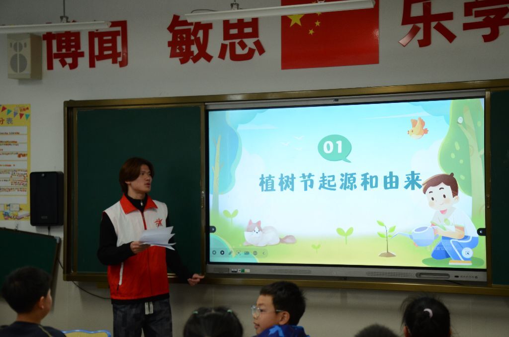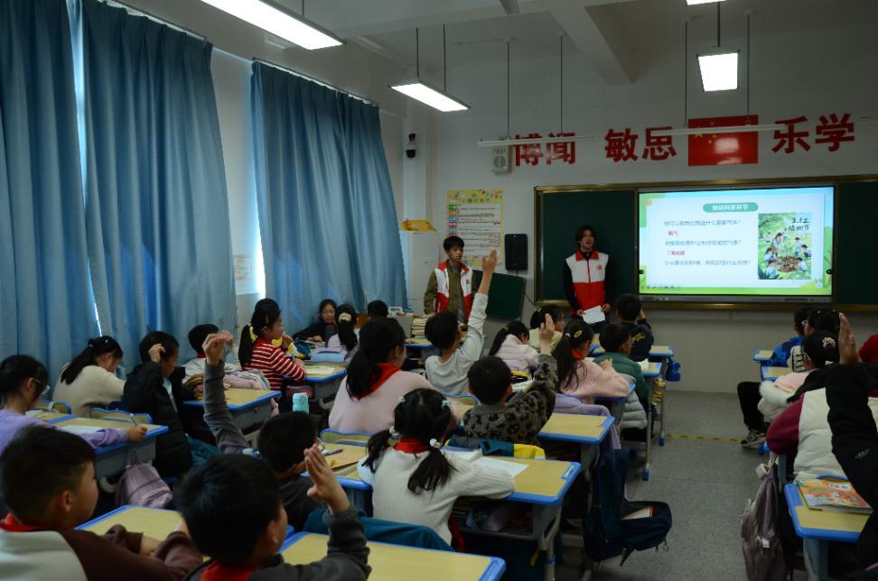 为增强课堂参与感与知识吸收效果,活动特别设置了植树知识问答环节。面对“中国的植树节是哪一天”等问题,同学们踊跃举手、积极作答,现场气氛十分热烈。在一问一答中,同学们不仅巩固了对植树节由来与意义的认识,也进一步理解了树木在生态保护中的重要作用。提问互动环节有效增强了宣讲活动的吸引力和感染力,使绿色环保知识在轻松活泼的氛围中入脑入心。