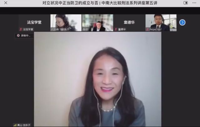 时值我校欢庆刑法学科研究生招生四十周年系列活动方兴未艾,为进一步助力刑法专业跨国际交流与比较研究步入新的台阶,我院于2022年11月12日晚19点在北大法宝学堂成功举办了“中南大比较刑法系列讲座”第五讲——“对立状况中正当防卫的成立与否”主题讲座。本次讲座由中南财经政法大学涉外刑事法研究中心与刑事司法学院共同举办,北大法宝学堂与北京周泰研究院协办。此次讲座我们荣幸地邀请到了来自日本京都大学法学研究科著名刑法学者高山佳奈子教授担任本次讲座的主讲人。