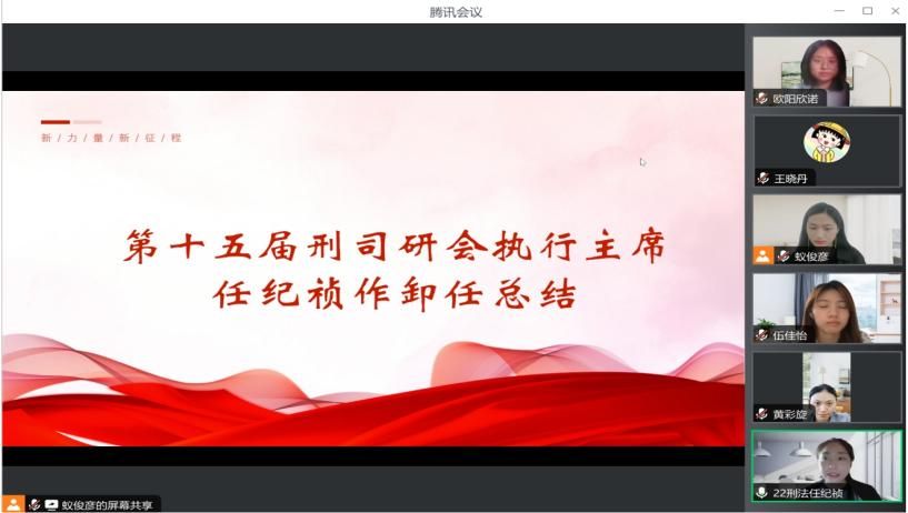 新闻网讯(学生通讯员 欧阳欣诺)为推进研会组织建设,加强内部凝聚力,做好研会承上启下工作,完成新旧负责人工作交接,7月3日上午9时,刑事司法学院第十六届研究生会换届大会于线上召开,刑事司法学院研究生会指导老师王晓丹出席,刑事司法学院第十五届研会负责人与第十六届研会负责人参加。