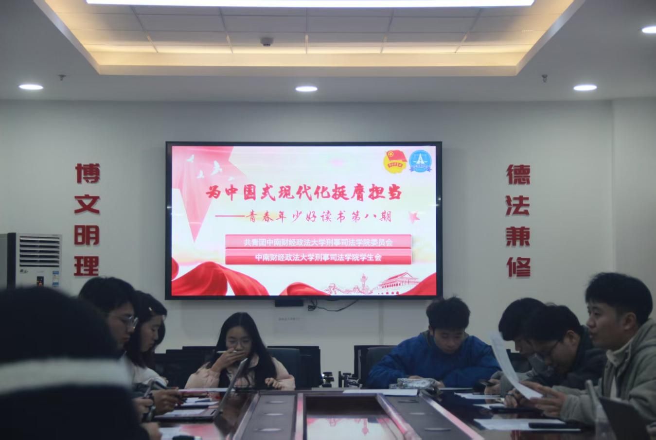 新闻网讯(学生通讯员 石咏和 姚知瑞 岳蕾静)为引领广大青年爱读书、读好书、善读书、学理论、读经典、促实干,2月27日晚,刑事司法学院学生会于文治楼二楼会议室举行了“为中国式现代化挺膺担当——青春年少好读书”主题读书季第八期活动。刑事司法学院分团委书记张凡稷、刑事司法学院第二十六届团学组织主要负责人参加本次读书会。