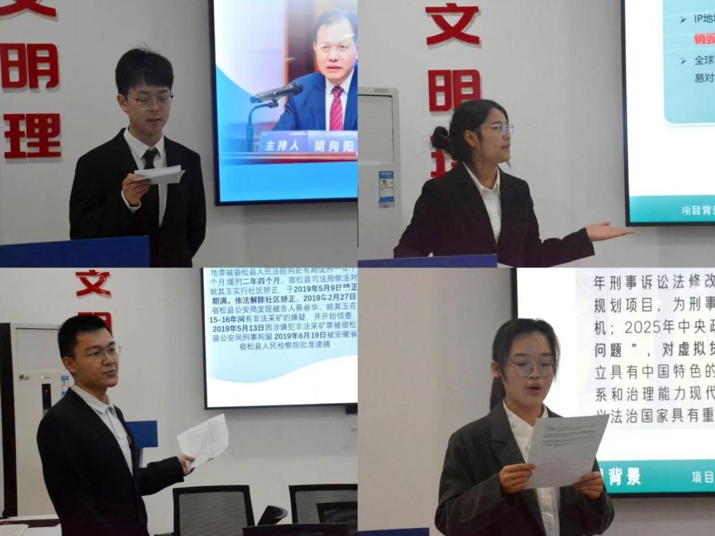 在创新类赛道的展示环节中,各团队依次呈现了多个前沿研究项目。首先是以端到端技术为核心的自动驾驶风险规避与社会治安问题研究;随后是网络犯罪侦查中公私合作机制的构建探索;接着是校园欺凌防治领域的AI预警与心理教育协同赋能体系;此外,还有针对金融法治与“反催收”黑灰组织的甄别预警及治理机制研究、基于大数据证据的刑事庭审困境与破解研究、黄精产业产学研融合的实地调研与分析,以及数智赋能下跨境虚拟货币洗钱犯罪证据固定的技术实现。区块链与云端智库的结合、缓刑撤销制度中漏罪发现标准的类型化分析、刑事涉案虚拟货币处置的困境与出路,以及基于博弈论的网络刷单返利诈骗预警劝阻机制创新等研究也相继亮相。