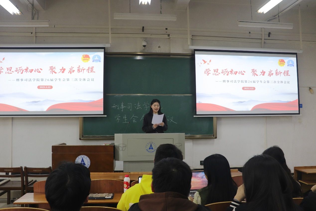 新闻网讯(学生通讯员 罗依 岳蕾静 朱彬彬)为凝聚青年力量,共谋发展新征程,3月22日,刑事司法学院于文澜110隆重召开了第26届学生会功能型团支部第三次全体会议。中南财经政法大学第二十七届研支团成员卢蕤、刑事司法学院学生会主席团成员、学生会各部门负责人及学生会大一干事参加此次会议,本次会议由刑事司法学院学生会主席团成员朱彬彬主持。