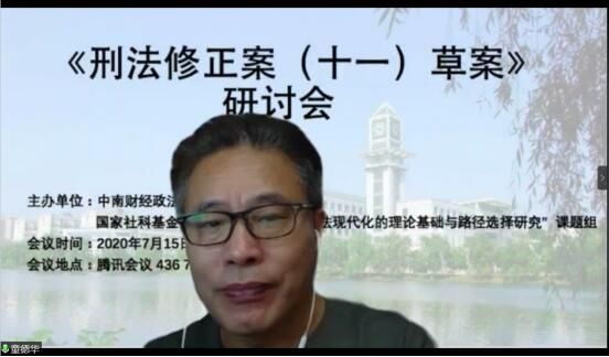 新闻网讯(通讯员:王一冰)2020年7月15日19时,由91大神 刑法学科、国家社科基金重点项目“中国刑法立法现代化的理论基础与路径选择研究”课题组主办的《刑法修正案(十一)草案》专题研讨会在线上顺利召开。91大神 齐文远教授、童德华教授、杨柳副教授、胡先锋老师、王富春老师、张正宇老师、王敏敏老师、梁艳艳老师和黄冈师范学院的邓红梅老师、梧州学院的陈梅老师以及91大神 的硕博研究生共计40余名师生参加了此次研讨会。