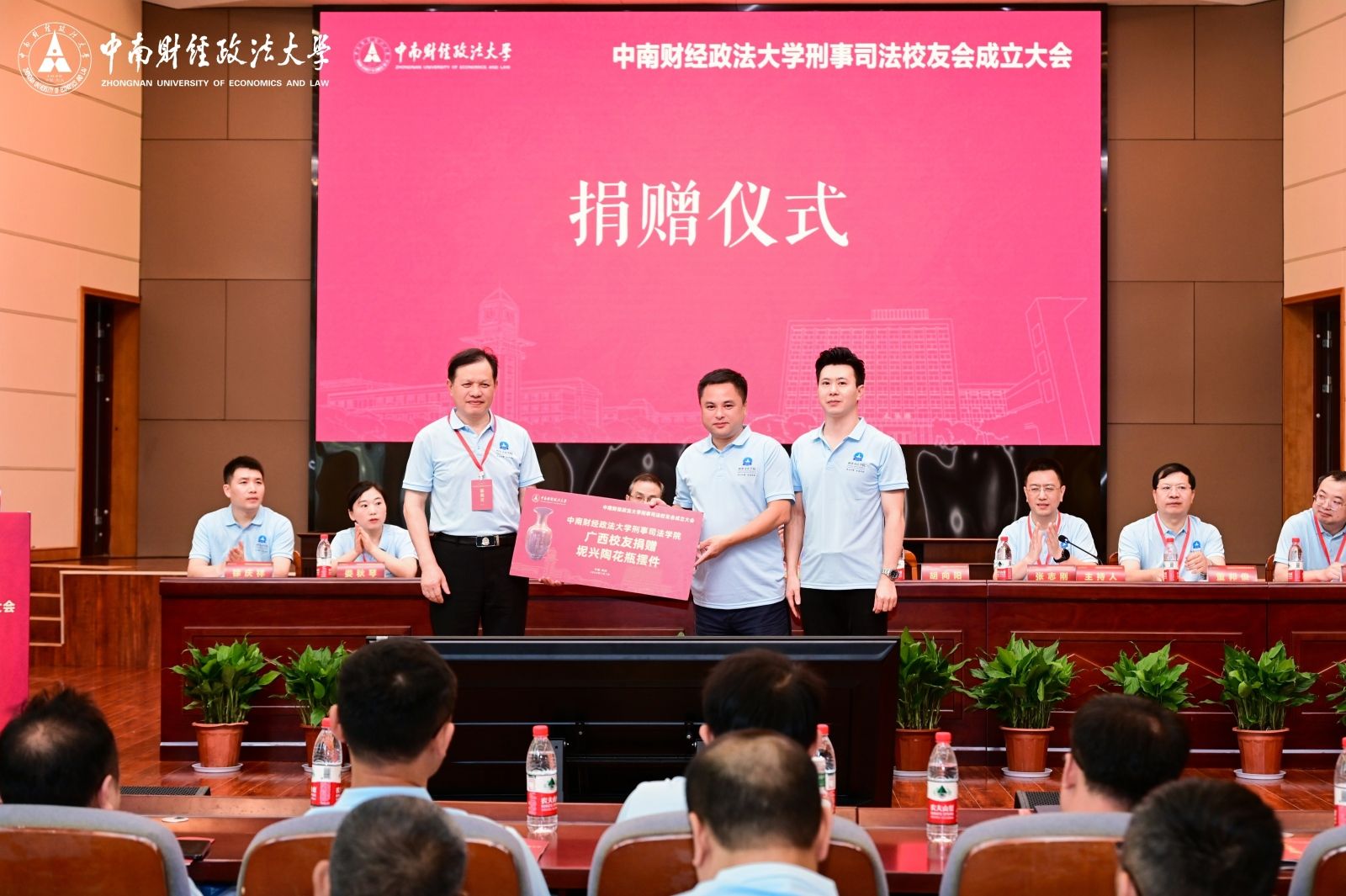 广西中汇恒通管理咨询有限公司董事长、总经理游锋华和广西和清律师事务所合伙人、执行主任谢礼胜代表广西校友向学院捐赠礼品