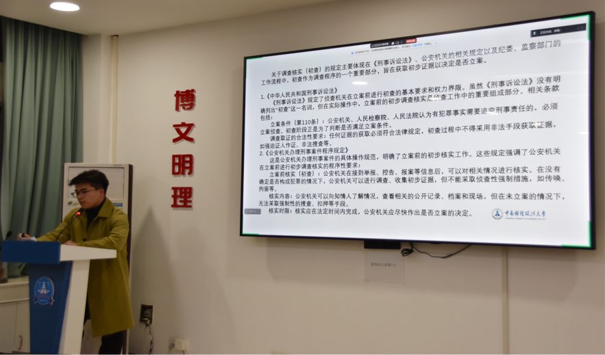 在点评环节,胡向阳教授指出,论文的问题设置不够聚焦,建议更明确地界定初查与证据合法性之间的冲突,增强逻辑性和层次感。杨敏教授则认为,论文需要对基础概念进行更为明晰的定义,确保读者对关键术语有准确的理解。刘建华副教授认为,论文应进一步关注人工智能在经济犯罪侦查中的具体应用,探讨其潜在的法律风险与挑战。其余老师和同学则针对论文的行文细节提出了若干问题,涉及证据合法性、技术手段的运用及国际合作等方面的深度探讨。