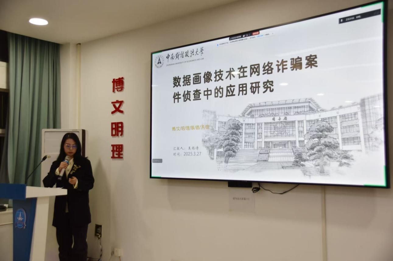 下一位同学是2023级侦查学硕士生王雨诗以《数据画像技术在网络诈骗案件侦查中的应用研究》为题展开深度分享。她首先阐释了数据画像的概念及其与智能人脸模拟画像和犯罪心理画像的关系,认为可将犯罪嫌疑人的整体数据画像划分为个人特征、社会交往特征、心理特征和职业技能特征四个维度,并介绍了画像数据的四个主要来源;她提出数据画像技 术在应用方面侧重于为预测、侦缉和串并案提供辅助,并重点分析了在电信网络诈骗犯罪案 件侦查中应用数据画像技术存在的问题,为此提出了区分数据优先级、重视被害人画像和线上线下画像相结合等多维度解决方案。