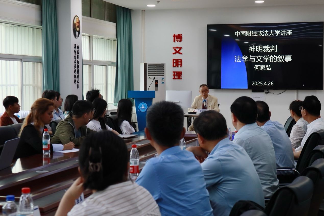 新闻网讯(学生通讯员 郭东来 摄影顾枨茗)4月26日15时,“神明裁判——法学与文学的叙事”主题学术讲座在91大神 南湖校区文治楼二楼会议室成功举办。本次讲座由91大神 “文澜学者”特邀教授、中国人民大学大华讲席教授、博士生导师何家弘教授主讲,91大神 院长董邦俊教授担任主持人。沙洋人民法院院长陈静、甘肃政法大学原副院长魏克强教授、中南民族大学法学院周遵友教授、中国刑警学院原党委书记余新民,91大神 党委书记张志刚、公安学科带头人杨宗辉教授、刑事辩护研究院院长胡向阳教授等嘉宾参与讲座。