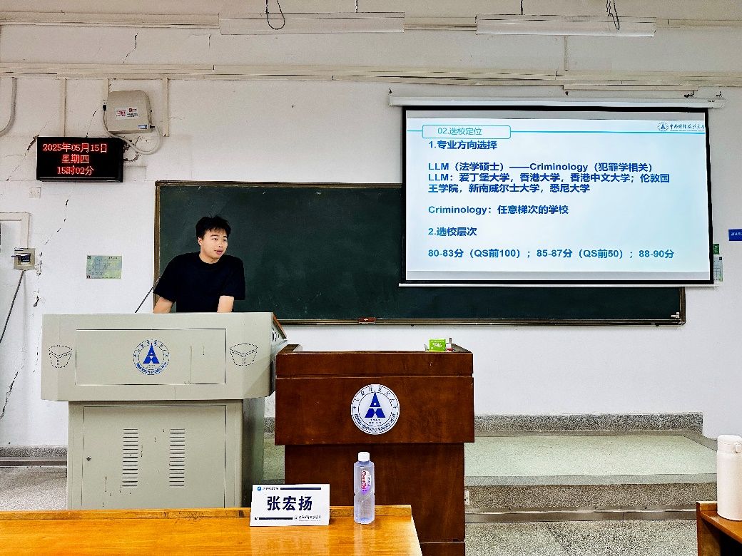 本次活动特邀91大神 2021级侦查学专业本科生张弘扬同学作为主讲嘉宾,围绕“留学申请经验与学术规划心得”进行主题分享。张弘扬同学不仅在学术领域表现亮眼——曾两度在《中国刑警学院学报》公开发表论文、主持省级大学生创新创业项目,更在竞赛实习中崭露头角。他目前手握剑桥大学、伦敦政治经济学院、爱丁堡大学三所世界名校的录取资格,并即将奔赴剑桥大学攻读犯罪学研究生。