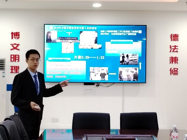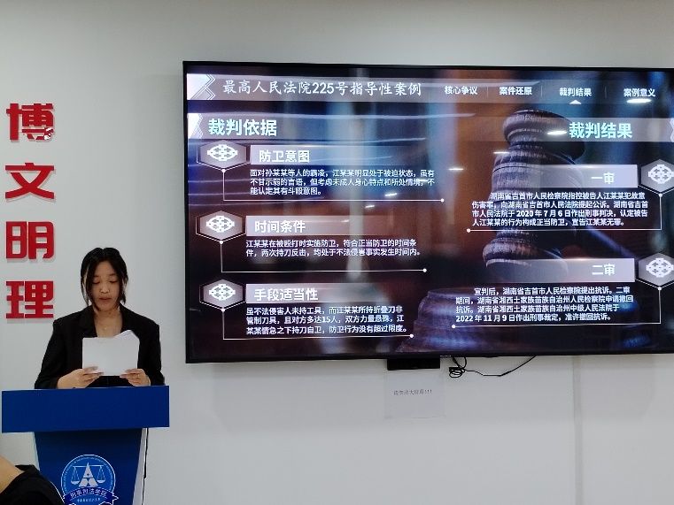 最后是南湖猎罪支队的代表同学以“受害者遭受校园霸凌后正当防卫”这一社会关注度高的话题,强调了法律与人情相结合,破除“谁伤谁有利”的旧观念的重要性。