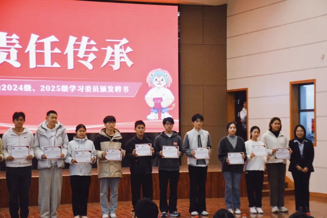 随后,学院党委副书记司志莲为2024级、2025级本科生学习委员颁发聘书,激励学生骨干在学风建设中发挥带头作用,凝聚朋辈力量,共建优良学风。